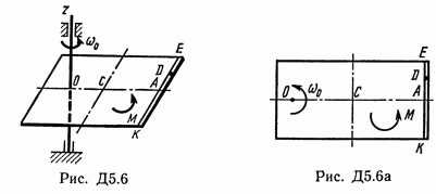 Д5 В69 - решение задачи по термеху из Тарга С.М. 1989 года. Условие к задаче Динамика 5: Однородная горизонтальная платформа (круглая радиуса R или прямоугольная со сторонами R и 2R, где R = 1,2 м) массой m1 = 24 кг вращается с угловой скоростью омега0 = 10 с-1 вокруг вертикальной оси z, отстоящей от центра масс C платформы на расстоянии OC = b (рис. Д5.0 —Д5.9, табл. Д5); размеры для всех прямоугольных платформ показаны на рис. Д5.0а (вид сверху). В момент времени t0 = 0 по желобу платформы начинает двигаться (под действием внутренних сил) груз D массой m2 = 8 кг по закону s = AD = F(t) где s выражено в метрах, t — в секундах. Одновременно на платформы начинает действовать пара сил с моментом М (задан в ньютонометрах; при М<0 его направление противоположно показанному на рисунках). Определить, пренебрегая массой вала, зависимость омега = f(t), т. е. угловую скорость платформы, как функцию времени. На всех рисунках груз D показан в положении, при котором s>0 (когда s<0, груз находится по другую сторону от точки А). Изображая чертеж решаемой задачи, провести ось z на заданном расстоянии OC = b от центра С.