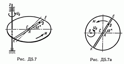 Д5 В73 - решение задачи по термеху из Тарга С.М. 1989 года. Условие к задаче Динамика 5: Однородная горизонтальная платформа (круглая радиуса R или прямоугольная со сторонами R и 2R, где R = 1,2 м) массой m1 = 24 кг вращается с угловой скоростью омега0 = 10 с-1 вокруг вертикальной оси z, отстоящей от центра масс C платформы на расстоянии OC = b (рис. Д5.0 —Д5.9, табл. Д5); размеры для всех прямоугольных платформ показаны на рис. Д5.0а (вид сверху). В момент времени t0 = 0 по желобу платформы начинает двигаться (под действием внутренних сил) груз D массой m2 = 8 кг по закону s = AD = F(t) где s выражено в метрах, t — в секундах. Одновременно на платформы начинает действовать пара сил с моментом М (задан в ньютонометрах; при М<0 его направление противоположно показанному на рисунках). Определить, пренебрегая массой вала, зависимость омега = f(t), т. е. угловую скорость платформы, как функцию времени. На всех рисунках груз D показан в положении, при котором s>0 (когда s<0, груз находится по другую сторону от точки А). Изображая чертеж решаемой задачи, провести ось z на заданном расстоянии OC = b от центра С.