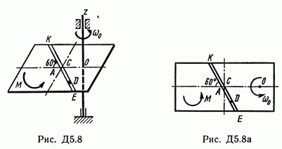 Д5 В88 - решение задачи по термеху из Тарга С.М. 1989 года. Условие к задаче Динамика 5: Однородная горизонтальная платформа (круглая радиуса R или прямоугольная со сторонами R и 2R, где R = 1,2 м) массой m1 = 24 кг вращается с угловой скоростью омега0 = 10 с-1 вокруг вертикальной оси z, отстоящей от центра масс C платформы на расстоянии OC = b (рис. Д5.0 —Д5.9, табл. Д5); размеры для всех прямоугольных платформ показаны на рис. Д5.0а (вид сверху). В момент времени t0 = 0 по желобу платформы начинает двигаться (под действием внутренних сил) груз D массой m2 = 8 кг по закону s = AD = F(t) где s выражено в метрах, t — в секундах. Одновременно на платформы начинает действовать пара сил с моментом М (задан в ньютонометрах; при М<0 его направление противоположно показанному на рисунках). Определить, пренебрегая массой вала, зависимость омега = f(t), т. е. угловую скорость платформы, как функцию времени. На всех рисунках груз D показан в положении, при котором s>0 (когда s<0, груз находится по другую сторону от точки А). Изображая чертеж решаемой задачи, провести ось z на заданном расстоянии OC = b от центра С.