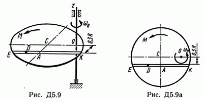Д5 В91 - решение задачи по термеху из Тарга С.М. 1989 года. Условие к задаче Динамика 5: Однородная горизонтальная платформа (круглая радиуса R или прямоугольная со сторонами R и 2R, где R = 1,2 м) массой m1 = 24 кг вращается с угловой скоростью омега0 = 10 с-1 вокруг вертикальной оси z, отстоящей от центра масс C платформы на расстоянии OC = b (рис. Д5.0 —Д5.9, табл. Д5); размеры для всех прямоугольных платформ показаны на рис. Д5.0а (вид сверху). В момент времени t0 = 0 по желобу платформы начинает двигаться (под действием внутренних сил) груз D массой m2 = 8 кг по закону s = AD = F(t) где s выражено в метрах, t — в секундах. Одновременно на платформы начинает действовать пара сил с моментом М (задан в ньютонометрах; при М<0 его направление противоположно показанному на рисунках). Определить, пренебрегая массой вала, зависимость омега = f(t), т. е. угловую скорость платформы, как функцию времени. На всех рисунках груз D показан в положении, при котором s>0 (когда s<0, груз находится по другую сторону от точки А). Изображая чертеж решаемой задачи, провести ось z на заданном расстоянии OC = b от центра С.