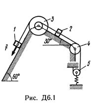 Решение задачи Д6 Вариант 15 - по термеху из Тарга С.М. 1989 года. Условие к задаче Динамика 6: Механическая система состоит из грузов 1 и 2, ступенчатого шкива 3 с радиусами ступеней R3 = 0,3 м, r3 = 0,1 м и радиусом инерции относительно оси вращения ρ3 = 0,2 м, блока 4 радиуса R4 = 0,2 м и катка (или подвижного блока) 5 (рис. Д6.0 — Д6.9, табл. Д6); тело 5 считать сплошным однородным цилиндром, а массу блока 4 — равномерно распределенной по ободу. Коэффициент трения грузов о плоскость f = 0,1. Тела системы соединены друг с другом нитями, перекинутыми через блоки и намотанными на шкив 3 (или на шкив и каток); участки нитей параллельны соответствующим плоскостям. К одному из тел прикреплена пружина с коэффициентом жесткости c. Под действием силы F = f(s), зависящей от перемещения s точки ее приложения, система приходит в движение из состояния покоя; деформация пружины в момент начала движения равна нулю. При движении на шкив 3 действует постоянный момент М сил сопротивления (от трения в подшипниках). Определить значение искомой величины в тот момент времени, когда перемещение s станет равным s1 = 0,2 м. Искомая величина указана в столбце «Найти» таблицы, где обозначено: v1, v2, vC5 — скорости грузов 1, 2 и центра масс тела 5 соответственно, омега3 и омега 4 — угловые скорости тел 3 и 4. Все катки, включая и катки, обмотанные нитями (как, например, каток 5 на рис. 2), катятся по плоскостям без скольжения. На всех рисунках не изображать груз 2, если m2 = 0; остальные тела должны изображаться и тогда, когда их масса равна нулю.