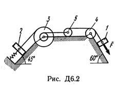 Решение задачи Д6 Вариант 26 - по термеху из Тарга С.М. 1989 года. Условие к задаче Динамика 6: Механическая система состоит из грузов 1 и 2, ступенчатого шкива 3 с радиусами ступеней R3 = 0,3 м, r3 = 0,1 м и радиусом инерции относительно оси вращения ρ3 = 0,2 м, блока 4 радиуса R4 = 0,2 м и катка (или подвижного блока) 5 (рис. Д6.0 — Д6.9, табл. Д6); тело 5 считать сплошным однородным цилиндром, а массу блока 4 — равномерно распределенной по ободу. Коэффициент трения грузов о плоскость f = 0,1. Тела системы соединены друг с другом нитями, перекинутыми через блоки и намотанными на шкив 3 (или на шкив и каток); участки нитей параллельны соответствующим плоскостям. К одному из тел прикреплена пружина с коэффициентом жесткости c. Под действием силы F = f(s), зависящей от перемещения s точки ее приложения, система приходит в движение из состояния покоя; деформация пружины в момент начала движения равна нулю. При движении на шкив 3 действует постоянный момент М сил сопротивления (от трения в подшипниках). Определить значение искомой величины в тот момент времени, когда перемещение s станет равным s1 = 0,2 м. Искомая величина указана в столбце «Найти» таблицы, где обозначено: v1, v2, vC5 — скорости грузов 1, 2 и центра масс тела 5 соответственно, омега3 и омега 4 — угловые скорости тел 3 и 4. Все катки, включая и катки, обмотанные нитями (как, например, каток 5 на рис. 2), катятся по плоскостям без скольжения. На всех рисунках не изображать груз 2, если m2 = 0; остальные тела должны изображаться и тогда, когда их масса равна нулю.