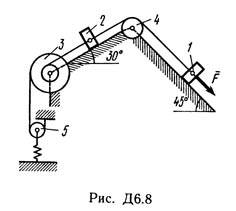 Решение задачи Д6 Вариант 89 - по термеху из Тарга С.М. 1989 года. Условие к задаче Динамика 6: Механическая система состоит из грузов 1 и 2, ступенчатого шкива 3 с радиусами ступеней R3 = 0,3 м, r3 = 0,1 м и радиусом инерции относительно оси вращения ρ3 = 0,2 м, блока 4 радиуса R4 = 0,2 м и катка (или подвижного блока) 5 (рис. Д6.0 — Д6.9, табл. Д6); тело 5 считать сплошным однородным цилиндром, а массу блока 4 — равномерно распределенной по ободу. Коэффициент трения грузов о плоскость f = 0,1. Тела системы соединены друг с другом нитями, перекинутыми через блоки и намотанными на шкив 3 (или на шкив и каток); участки нитей параллельны соответствующим плоскостям. К одному из тел прикреплена пружина с коэффициентом жесткости c. Под действием силы F = f(s), зависящей от перемещения s точки ее приложения, система приходит в движение из состояния покоя; деформация пружины в момент начала движения равна нулю. При движении на шкив 3 действует постоянный момент М сил сопротивления (от трения в подшипниках). Определить значение искомой величины в тот момент времени, когда перемещение s станет равным s1 = 0,2 м. Искомая величина указана в столбце «Найти» таблицы, где обозначено: v1, v2, vC5 — скорости грузов 1, 2 и центра масс тела 5 соответственно, омега3 и омега 4 — угловые скорости тел 3 и 4. Все катки, включая и катки, обмотанные нитями (как, например, каток 5 на рис. 2), катятся по плоскостям без скольжения. На всех рисунках не изображать груз 2, если m2 = 0; остальные тела должны изображаться и тогда, когда их масса равна нулю.