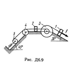 Решение задачи Д6 Вариант 97 - по термеху из Тарга С.М. 1989 года. Условие к задаче Динамика 6: Механическая система состоит из грузов 1 и 2, ступенчатого шкива 3 с радиусами ступеней R3 = 0,3 м, r3 = 0,1 м и радиусом инерции относительно оси вращения ρ3 = 0,2 м, блока 4 радиуса R4 = 0,2 м и катка (или подвижного блока) 5 (рис. Д6.0 — Д6.9, табл. Д6); тело 5 считать сплошным однородным цилиндром, а массу блока 4 — равномерно распределенной по ободу. Коэффициент трения грузов о плоскость f = 0,1. Тела системы соединены друг с другом нитями, перекинутыми через блоки и намотанными на шкив 3 (или на шкив и каток); участки нитей параллельны соответствующим плоскостям. К одному из тел прикреплена пружина с коэффициентом жесткости c. Под действием силы F = f(s), зависящей от перемещения s точки ее приложения, система приходит в движение из состояния покоя; деформация пружины в момент начала движения равна нулю. При движении на шкив 3 действует постоянный момент М сил сопротивления (от трения в подшипниках). Определить значение искомой величины в тот момент времени, когда перемещение s станет равным s1 = 0,2 м. Искомая величина указана в столбце «Найти» таблицы, где обозначено: v1, v2, vC5 — скорости грузов 1, 2 и центра масс тела 5 соответственно, омега3 и омега 4 — угловые скорости тел 3 и 4. Все катки, включая и катки, обмотанные нитями (как, например, каток 5 на рис. 2), катятся по плоскостям без скольжения. На всех рисунках не изображать груз 2, если m2 = 0; остальные тела должны изображаться и тогда, когда их масса равна нулю.