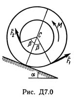 Решение задачи Д7 Вариант 03 - по термеху из Тарга С.М. 1989 года. Условие к задаче Динамика 7 (страница 78): Барабан радиуса R весом P имеет выточку (как у катушки) радиуса r = 0,6R (рис. Д7.0 — Д7.9, табл. Д7). К концам намотанных на барабан нитей приложены постоянные силы F1 и F2, направления которых определяются углом Бетта; кроме сил на барабан действует пара с моментом М; когда в таблице М<0, направление момента противоположно показанному на рисунке. При движении, начинающемся из состояния покоя, барабан катится без скольжения по шероховатой наклонной плоскости с углом наклона α так, как показано на рисунках. Пренебрегая сопротивлением качению, определить закон движения центра масс С барабана, т. е. xC = f(t), и наименьшее значение коэффициента трения f о плоскость, при котором возможно качение без скольжения. Барабан рассматривать как сплошной однородный цилиндр радиуса R.