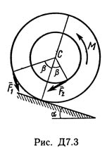Решение задачи Д7 Вариант 36 - по термеху из Тарга С.М. 1989 года. Условие к задаче Динамика 7 (страница 78): Барабан радиуса R весом P имеет выточку (как у катушки) радиуса r = 0,6R (рис. Д7.0 — Д7.9, табл. Д7). К концам намотанных на барабан нитей приложены постоянные силы F1 и F2, направления которых определяются углом Бетта; кроме сил на барабан действует пара с моментом М; когда в таблице М<0, направление момента противоположно показанному на рисунке. При движении, начинающемся из состояния покоя, барабан катится без скольжения по шероховатой наклонной плоскости с углом наклона α так, как показано на рисунках. Пренебрегая сопротивлением качению, определить закон движения центра масс С барабана, т. е. xC = f(t), и наименьшее значение коэффициента трения f о плоскость, при котором возможно качение без скольжения. Барабан рассматривать как сплошной однородный цилиндр радиуса R.