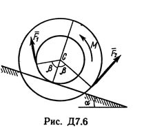 Решение задачи Д7 Вариант 66 - по термеху из Тарга С.М. 1989 года. Условие к задаче Динамика 7 (страница 78): Барабан радиуса R весом P имеет выточку (как у катушки) радиуса r = 0,6R (рис. Д7.0 — Д7.9, табл. Д7). К концам намотанных на барабан нитей приложены постоянные силы F1 и F2, направления которых определяются углом Бетта; кроме сил на барабан действует пара с моментом М; когда в таблице М<0, направление момента противоположно показанному на рисунке. При движении, начинающемся из состояния покоя, барабан катится без скольжения по шероховатой наклонной плоскости с углом наклона α так, как показано на рисунках. Пренебрегая сопротивлением качению, определить закон движения центра масс С барабана, т. е. xC = f(t), и наименьшее значение коэффициента трения f о плоскость, при котором возможно качение без скольжения. Барабан рассматривать как сплошной однородный цилиндр радиуса R.