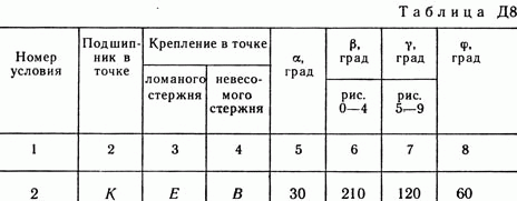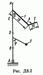 Решение задачи Д8 Вариант 22 - по термеху из Тарга С.М. 1989 года. Условие к задаче Динамика 8 (страница 78): Вертикальный вал АК (рис. Д8.0 — Д8.9), вращающийся с постоянной угловой скоростью омега = 10 с-1, закреплен подпятником в точке A и цилиндрическим подшипником в точке, указанной в табл. Д8 в столбце 2 (АВ = BD = DE = ЕК = a). К валу жестко прикреплены тонкий однородный ломаный стержень массой m = 10 кг, состоящий из частей 1 и 2 (размеры частей стержня показаны на рисунках, где b = 0,1 м, а их массы m1 и m2 пропорциональны длинам), и невесомый стержень длиной l = 4b с точечной массой m3 = 3 кг на конце; оба стержня лежат в одной плоскости. Точки крепления стержней указаны в таблице в столбцах 3 и 4, а углы альфа, бетта, сигма, фи даны в столбцах 5—8. Пренебрегая весом вала, определить реакции подпятника и подшипника. При подсчетах принять а = 0,6 м.