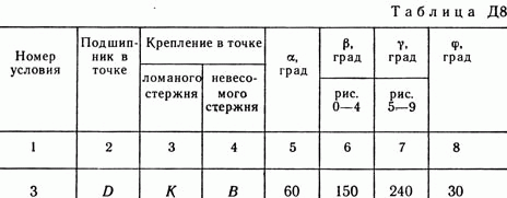 Решение задачи Д8 Вариант 33 - по термеху из Тарга С.М. 1989 года. Условие к задаче Динамика 8 (страница 78): Вертикальный вал АК (рис. Д8.0 — Д8.9), вращающийся с постоянной угловой скоростью омега = 10 с-1, закреплен подпятником в точке A и цилиндрическим подшипником в точке, указанной в табл. Д8 в столбце 2 (АВ = BD = DE = ЕК = a). К валу жестко прикреплены тонкий однородный ломаный стержень массой m = 10 кг, состоящий из частей 1 и 2 (размеры частей стержня показаны на рисунках, где b = 0,1 м, а их массы m1 и m2 пропорциональны длинам), и невесомый стержень длиной l = 4b с точечной массой m3 = 3 кг на конце; оба стержня лежат в одной плоскости. Точки крепления стержней указаны в таблице в столбцах 3 и 4, а углы альфа, бетта, сигма, фи даны в столбцах 5—8. Пренебрегая весом вала, определить реакции подпятника и подшипника. При подсчетах принять а = 0,6 м.