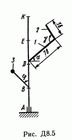 Решение задачи Д8 Вариант 58 - по термеху из Тарга С.М. 1989 года. Условие к задаче Динамика 8 (страница 78): Вертикальный вал АК (рис. Д8.0 — Д8.9), вращающийся с постоянной угловой скоростью омега = 10 с-1, закреплен подпятником в точке A и цилиндрическим подшипником в точке, указанной в табл. Д8 в столбце 2 (АВ = BD = DE = ЕК = a). К валу жестко прикреплены тонкий однородный ломаный стержень массой m = 10 кг, состоящий из частей 1 и 2 (размеры частей стержня показаны на рисунках, где b = 0,1 м, а их массы m1 и m2 пропорциональны длинам), и невесомый стержень длиной l = 4b с точечной массой m3 = 3 кг на конце; оба стержня лежат в одной плоскости. Точки крепления стержней указаны в таблице в столбцах 3 и 4, а углы альфа, бетта, сигма, фи даны в столбцах 5—8. Пренебрегая весом вала, определить реакции подпятника и подшипника. При подсчетах принять а = 0,6 м.