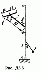 Решение задачи Д8 Вариант 67 - по термеху из Тарга С.М. 1989 года. Условие к задаче Динамика 8 (страница 78): Вертикальный вал АК (рис. Д8.0 — Д8.9), вращающийся с постоянной угловой скоростью омега = 10 с-1, закреплен подпятником в точке A и цилиндрическим подшипником в точке, указанной в табл. Д8 в столбце 2 (АВ = BD = DE = ЕК = a). К валу жестко прикреплены тонкий однородный ломаный стержень массой m = 10 кг, состоящий из частей 1 и 2 (размеры частей стержня показаны на рисунках, где b = 0,1 м, а их массы m1 и m2 пропорциональны длинам), и невесомый стержень длиной l = 4b с точечной массой m3 = 3 кг на конце; оба стержня лежат в одной плоскости. Точки крепления стержней указаны в таблице в столбцах 3 и 4, а углы альфа, бетта, сигма, фи даны в столбцах 5—8. Пренебрегая весом вала, определить реакции подпятника и подшипника. При подсчетах принять а = 0,6 м.