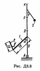 Решение задачи Д8 Вариант 83 - по термеху из Тарга С.М. 1989 года. Условие к задаче Динамика 8 (страница 78): Вертикальный вал АК (рис. Д8.0 — Д8.9), вращающийся с постоянной угловой скоростью омега = 10 с-1, закреплен подпятником в точке A и цилиндрическим подшипником в точке, указанной в табл. Д8 в столбце 2 (АВ = BD = DE = ЕК = a). К валу жестко прикреплены тонкий однородный ломаный стержень массой m = 10 кг, состоящий из частей 1 и 2 (размеры частей стержня показаны на рисунках, где b = 0,1 м, а их массы m1 и m2 пропорциональны длинам), и невесомый стержень длиной l = 4b с точечной массой m3 = 3 кг на конце; оба стержня лежат в одной плоскости. Точки крепления стержней указаны в таблице в столбцах 3 и 4, а углы альфа, бетта, сигма, фи даны в столбцах 5—8. Пренебрегая весом вала, определить реакции подпятника и подшипника. При подсчетах принять а = 0,6 м.