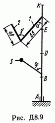 Решение задачи Д8 Вариант 97 - по термеху из Тарга С.М. 1989 года. Условие к задаче Динамика 8 (страница 78): Вертикальный вал АК (рис. Д8.0 — Д8.9), вращающийся с постоянной угловой скоростью омега = 10 с-1, закреплен подпятником в точке A и цилиндрическим подшипником в точке, указанной в табл. Д8 в столбце 2 (АВ = BD = DE = ЕК = a). К валу жестко прикреплены тонкий однородный ломаный стержень массой m = 10 кг, состоящий из частей 1 и 2 (размеры частей стержня показаны на рисунках, где b = 0,1 м, а их массы m1 и m2 пропорциональны длинам), и невесомый стержень длиной l = 4b с точечной массой m3 = 3 кг на конце; оба стержня лежат в одной плоскости. Точки крепления стержней указаны в таблице в столбцах 3 и 4, а углы альфа, бетта, сигма, фи даны в столбцах 5—8. Пренебрегая весом вала, определить реакции подпятника и подшипника. При подсчетах принять а = 0,6 м.