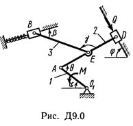 Решение задачи Д9 Вариант 02 - по термеху из Тарга С.М. 1989 года. Условие к задаче Динамика 9 (Полное условие на странице 86): Механизм, расположенный в горизонтальной плоскости, находится под действием приложенных сил в равновесии; положение равновесия определяется углами a, B, γ, фи, тетта (рис. Д9.0 — Д9.9, табл. Д9а и Д9б). Длины стержней механизма (кривошипов) равны: l1 = 0,4 м, l4 = 0,6 м (размеры l2 и l3 произвольны); точка Е находится в середине соответствующего стержня. На ползун В механизма действует сила упругости пружины F; численно F = с*l, где с — коэффициент жесткости пружины, l — ее деформация. Кроме того, на рис. 0 и 1 на ползун D действует сила Q, а на кривошип O1А — пара сил с моментом М; на рис. 2—9 на кривошипы O1А и O2D действуют пары сил с моментами М1 и M2. Определить, чему равна при равновесии деформация l пружины, и указать, растянута пружина или сжата. Значения всех заданных величин приведены в табл. Д9а для рис. 0—4 и в табл. Д9б для рис. 5—9, где Q выражено в ньютонах, а М, М1, М2 — в ньютонометрах. Построение чертежа начинать со стержня, направление которого определяется углом α; для большей наглядности ползун с направляющими и пружину изобразить так, как в примере Д9 (см. рис. Д9, а также рис. Д9.10, б). Если на чертеже решаемого варианта задачи прикрепленный к ползуну В стержень окажется совмещенным с пружиной (как на рис. Д9.10, а), то пружину следует считать прикрепленной к ползуну с другой стороны (как на рис. Д9.10, б, где одновременно иначе изображены направляющие).