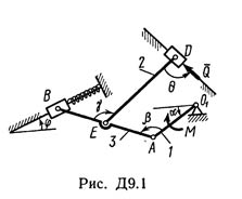 Решение задачи Д9 Вариант 18 - по термеху из Тарга С.М. 1989 года. Условие к задаче Динамика 9 (Полное условие на странице 86): Механизм, расположенный в горизонтальной плоскости, находится под действием приложенных сил в равновесии; положение равновесия определяется углами a, B, γ, фи, тетта (рис. Д9.0 — Д9.9, табл. Д9а и Д9б). Длины стержней механизма (кривошипов) равны: l1 = 0,4 м, l4 = 0,6 м (размеры l2 и l3 произвольны); точка Е находится в середине соответствующего стержня. На ползун В механизма действует сила упругости пружины F; численно F = с*l, где с — коэффициент жесткости пружины, l — ее деформация. Кроме того, на рис. 0 и 1 на ползун D действует сила Q, а на кривошип O1А — пара сил с моментом М; на рис. 2—9 на кривошипы O1А и O2D действуют пары сил с моментами М1 и M2. Определить, чему равна при равновесии деформация l пружины, и указать, растянута пружина или сжата. Значения всех заданных величин приведены в табл. Д9а для рис. 0—4 и в табл. Д9б для рис. 5—9, где Q выражено в ньютонах, а М, М1, М2 — в ньютонометрах. Построение чертежа начинать со стержня, направление которого определяется углом α; для большей наглядности ползун с направляющими и пружину изобразить так, как в примере Д9 (см. рис. Д9, а также рис. Д9.10, б). Если на чертеже решаемого варианта задачи прикрепленный к ползуну В стержень окажется совмещенным с пружиной (как на рис. Д9.10, а), то пружину следует считать прикрепленной к ползуну с другой стороны (как на рис. Д9.10, б, где одновременно иначе изображены направляющие).
