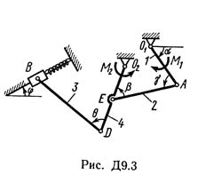 Решение задачи Д9 Вариант 38 - по термеху из Тарга С.М. 1989 года. Условие к задаче Динамика 9 (Полное условие на странице 86): Механизм, расположенный в горизонтальной плоскости, находится под действием приложенных сил в равновесии; положение равновесия определяется углами a, B, γ, фи, тетта (рис. Д9.0 — Д9.9, табл. Д9а и Д9б). Длины стержней механизма (кривошипов) равны: l1 = 0,4 м, l4 = 0,6 м (размеры l2 и l3 произвольны); точка Е находится в середине соответствующего стержня. На ползун В механизма действует сила упругости пружины F; численно F = с*l, где с — коэффициент жесткости пружины, l — ее деформация. Кроме того, на рис. 0 и 1 на ползун D действует сила Q, а на кривошип O1А — пара сил с моментом М; на рис. 2—9 на кривошипы O1А и O2D действуют пары сил с моментами М1 и M2. Определить, чему равна при равновесии деформация l пружины, и указать, растянута пружина или сжата. Значения всех заданных величин приведены в табл. Д9а для рис. 0—4 и в табл. Д9б для рис. 5—9, где Q выражено в ньютонах, а М, М1, М2 — в ньютонометрах. Построение чертежа начинать со стержня, направление которого определяется углом α; для большей наглядности ползун с направляющими и пружину изобразить так, как в примере Д9 (см. рис. Д9, а также рис. Д9.10, б). Если на чертеже решаемого варианта задачи прикрепленный к ползуну В стержень окажется совмещенным с пружиной (как на рис. Д9.10, а), то пружину следует считать прикрепленной к ползуну с другой стороны (как на рис. Д9.10, б, где одновременно иначе изображены направляющие).