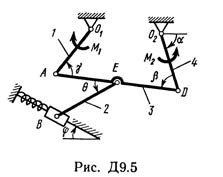 Решение задачи Д9 Вариант 53 - по термеху из Тарга С.М. 1989 года. Условие к задаче Динамика 9 (Полное условие на странице 86): Механизм, расположенный в горизонтальной плоскости, находится под действием приложенных сил в равновесии; положение равновесия определяется углами a, B, γ, фи, тетта (рис. Д9.0 — Д9.9, табл. Д9а и Д9б). Длины стержней механизма (кривошипов) равны: l1 = 0,4 м, l4 = 0,6 м (размеры l2 и l3 произвольны); точка Е находится в середине соответствующего стержня. На ползун В механизма действует сила упругости пружины F; численно F = с*l, где с — коэффициент жесткости пружины, l — ее деформация. Кроме того, на рис. 0 и 1 на ползун D действует сила Q, а на кривошип O1А — пара сил с моментом М; на рис. 2—9 на кривошипы O1А и O2D действуют пары сил с моментами М1 и M2. Определить, чему равна при равновесии деформация l пружины, и указать, растянута пружина или сжата. Значения всех заданных величин приведены в табл. Д9а для рис. 0—4 и в табл. Д9б для рис. 5—9, где Q выражено в ньютонах, а М, М1, М2 — в ньютонометрах. Построение чертежа начинать со стержня, направление которого определяется углом α; для большей наглядности ползун с направляющими и пружину изобразить так, как в примере Д9 (см. рис. Д9, а также рис. Д9.10, б). Если на чертеже решаемого варианта задачи прикрепленный к ползуну В стержень окажется совмещенным с пружиной (как на рис. Д9.10, а), то пружину следует считать прикрепленной к ползуну с другой стороны (как на рис. Д9.10, б, где одновременно иначе изображены направляющие).