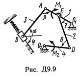Решение задачи Д9 Вариант 92 - по термеху из Тарга С.М. 1989 года. Условие к задаче Динамика 9 (Полное условие на странице 86): Механизм, расположенный в горизонтальной плоскости, находится под действием приложенных сил в равновесии; положение равновесия определяется углами a, B, γ, фи, тетта (рис. Д9.0 — Д9.9, табл. Д9а и Д9б). Длины стержней механизма (кривошипов) равны: l1 = 0,4 м, l4 = 0,6 м (размеры l2 и l3 произвольны); точка Е находится в середине соответствующего стержня. На ползун В механизма действует сила упругости пружины F; численно F = с*l, где с — коэффициент жесткости пружины, l — ее деформация. Кроме того, на рис. 0 и 1 на ползун D действует сила Q, а на кривошип O1А — пара сил с моментом М; на рис. 2—9 на кривошипы O1А и O2D действуют пары сил с моментами М1 и M2. Определить, чему равна при равновесии деформация l пружины, и указать, растянута пружина или сжата. Значения всех заданных величин приведены в табл. Д9а для рис. 0—4 и в табл. Д9б для рис. 5—9, где Q выражено в ньютонах, а М, М1, М2 — в ньютонометрах. Построение чертежа начинать со стержня, направление которого определяется углом α; для большей наглядности ползун с направляющими и пружину изобразить так, как в примере Д9 (см. рис. Д9, а также рис. Д9.10, б). Если на чертеже решаемого варианта задачи прикрепленный к ползуну В стержень окажется совмещенным с пружиной (как на рис. Д9.10, а), то пружину следует считать прикрепленной к ползуну с другой стороны (как на рис. Д9.10, б, где одновременно иначе изображены направляющие).