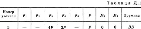 Решение задачи по теормеху из решебника С.М. Тарга 1989 г. Д11 Вариант 15. Условие к задаче Динамика 11 (Полное условие на странице 95): Механическая система состоит из тел 1, 2, …, 5 весом P1, Р2, …, P5 соответственно, связанных друг с другом нитями, намотанными на ступенчатые блоки 1 и 2 (рис. Д11.0 — Д11.9, табл. Д11). Радиусы ступенчатых блоков 1 и 2 равны соответственно R1 = R, r1 = 0,4R, R2 = R, r2 = 0,8R. При вычислении моментов инерции все блоки, катки и колеса считать однородными сплошными цилиндрами радиуса R. На систему кроме сил тяжести действует сила F, приложенная к телу 3 или 4 (если тело 3 в систему не входит, сила приложена в точке В к тележке), и пары сил с моментами М1, M2, приложенные к блокам 1 и 2; когда М<0, направление момента противоположно показанному на рисунке. На участке нити, указанном в таблице в столбце «Пружина», включена пружина с коэффициентом жесткости с (например, если в столбце стоит АВ, то участок АВ является пружиной, если AD, то AD — пружина и т.д.); в начальный момент времени пружина не деформирована. Составить для системы уравнения Лагранжа и найти закон изменения обобщенной координаты x, т. е. x = f(t), считая, что движение начинается из состояния покоя; определить также частоту и период колебаний, совершаемых телами системы при ее движении (о выборе координаты x см. «Указания»). Прочерк в столбцах таблицы, где заданы веса, означает, что соответствующее тело в систему не входит (на чертеже не изображать), а ноль — что тело считается невесомым, но в систему входит; для колес, обозначенных номером 4, Р4 — их общий вес (вес платформы такой тележки не учитывается).