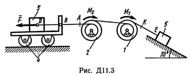 Решение задачи по теормеху из решебника С.М. Тарга 1989 г. Д11 Вариант 32. Условие к задаче Динамика 11 (Полное условие на странице 95): Механическая система состоит из тел 1, 2, …, 5 весом P1, Р2, …, P5 соответственно, связанных друг с другом нитями, намотанными на ступенчатые блоки 1 и 2 (рис. Д11.0 — Д11.9, табл. Д11). Радиусы ступенчатых блоков 1 и 2 равны соответственно R1 = R, r1 = 0,4R, R2 = R, r2 = 0,8R. При вычислении моментов инерции все блоки, катки и колеса считать однородными сплошными цилиндрами радиуса R. На систему кроме сил тяжести действует сила F, приложенная к телу 3 или 4 (если тело 3 в систему не входит, сила приложена в точке В к тележке), и пары сил с моментами М1, M2, приложенные к блокам 1 и 2; когда М<0, направление момента противоположно показанному на рисунке. На участке нити, указанном в таблице в столбце «Пружина», включена пружина с коэффициентом жесткости с (например, если в столбце стоит АВ, то участок АВ является пружиной, если AD, то AD — пружина и т.д.); в начальный момент времени пружина не деформирована. Составить для системы уравнения Лагранжа и найти закон изменения обобщенной координаты x, т. е. x = f(t), считая, что движение начинается из состояния покоя; определить также частоту и период колебаний, совершаемых телами системы при ее движении (о выборе координаты x см. «Указания»). Прочерк в столбцах таблицы, где заданы веса, означает, что соответствующее тело в систему не входит (на чертеже не изображать), а ноль — что тело считается невесомым, но в систему входит; для колес, обозначенных номером 4, Р4 — их общий вес (вес платформы такой тележки не учитывается).