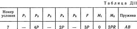Решение задачи по теормеху из решебника С.М. Тарга 1989 г. Д11 Вариант 57. Условие к задаче Динамика 11 (Полное условие на странице 95): Механическая система состоит из тел 1, 2, …, 5 весом P1, Р2, …, P5 соответственно, связанных друг с другом нитями, намотанными на ступенчатые блоки 1 и 2 (рис. Д11.0 — Д11.9, табл. Д11). Радиусы ступенчатых блоков 1 и 2 равны соответственно R1 = R, r1 = 0,4R, R2 = R, r2 = 0,8R. При вычислении моментов инерции все блоки, катки и колеса считать однородными сплошными цилиндрами радиуса R. На систему кроме сил тяжести действует сила F, приложенная к телу 3 или 4 (если тело 3 в систему не входит, сила приложена в точке В к тележке), и пары сил с моментами М1, M2, приложенные к блокам 1 и 2; когда М<0, направление момента противоположно показанному на рисунке. На участке нити, указанном в таблице в столбце «Пружина», включена пружина с коэффициентом жесткости с (например, если в столбце стоит АВ, то участок АВ является пружиной, если AD, то AD — пружина и т.д.); в начальный момент времени пружина не деформирована. Составить для системы уравнения Лагранжа и найти закон изменения обобщенной координаты x, т. е. x = f(t), считая, что движение начинается из состояния покоя; определить также частоту и период колебаний, совершаемых телами системы при ее движении (о выборе координаты x см. «Указания»). Прочерк в столбцах таблицы, где заданы веса, означает, что соответствующее тело в систему не входит (на чертеже не изображать), а ноль — что тело считается невесомым, но в систему входит; для колес, обозначенных номером 4, Р4 — их общий вес (вес платформы такой тележки не учитывается).