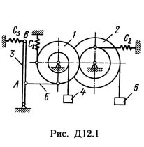 Готовое решение задачи Д12 Вариант 13 по теоретической механике из Тарга С.М. 1989 г.. Условие к задаче Динамика 12 (стр. 101 в методичке Тарга): Механизм, расположенный в вертикальной плоскости (рис. Д12.0 — Д12.9), состоит из ступенчатых колес 1 и 2 с радиусами R1 = 0,4 м, r1 = 0,2 м, R2 = 0,5 м, r2 = 0,3 м, имеющих неподвижные оси вращения; однородного стержня 3 длиной l =1,2 м, закрепленного шарниром на одном из концов; грузов 4 и 5, подвешенных к нитям, намотанным на колеса. На стержне расстояние АВ = 2l/3. Стержень 3 соединен с колесом 2 невесомым стержнем 6. Колеса 1 и 2 или находятся в зацеплении (рис. 0—4), или соединены невесомым стержнем 7 (рис. 5—9). К колесам и стержню 3 прикреплены пружины. В табл. Д12 заданы массы mi тел (кг) и коэффициенты жесткости ci пружин (Н/м). Прочерки в столбцах таблицы означают, что соответствующие тела или пружины в систему не входят (на чертеже эти тела и пружины не изображать); в результате в каждом конкретном варианте получается довольно простой механизм, содержащий три или даже два тела. Стержень 6 или 7 входит в состав механизма, когда в него входят оба тела, соединенные этим стержнем. В положениях, изображенных на рисунках, механизм находится в равновесии. Определить частоту и период малых колебаний системы около положения равновесия. Найти также, чему равно статическое удлинение (сжатие) пружины λст в положении равновесия. При подсчетах считать колеса 1 и 2 сплошными однородными цилиндрами радиусов R1 и R2 соответственно. Рассмотрим два примера решения этой задачи.