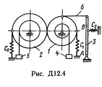 Готовое решение задачи Д12 Вариант 41 по теоретической механике из Тарга С.М. 1989 г.. Условие к задаче Динамика 12 (стр. 101 в методичке Тарга): Механизм, расположенный в вертикальной плоскости (рис. Д12.0 — Д12.9), состоит из ступенчатых колес 1 и 2 с радиусами R1 = 0,4 м, r1 = 0,2 м, R2 = 0,5 м, r2 = 0,3 м, имеющих неподвижные оси вращения; однородного стержня 3 длиной l =1,2 м, закрепленного шарниром на одном из концов; грузов 4 и 5, подвешенных к нитям, намотанным на колеса. На стержне расстояние АВ = 2l/3. Стержень 3 соединен с колесом 2 невесомым стержнем 6. Колеса 1 и 2 или находятся в зацеплении (рис. 0—4), или соединены невесомым стержнем 7 (рис. 5—9). К колесам и стержню 3 прикреплены пружины. В табл. Д12 заданы массы mi тел (кг) и коэффициенты жесткости ci пружин (Н/м). Прочерки в столбцах таблицы означают, что соответствующие тела или пружины в систему не входят (на чертеже эти тела и пружины не изображать); в результате в каждом конкретном варианте получается довольно простой механизм, содержащий три или даже два тела. Стержень 6 или 7 входит в состав механизма, когда в него входят оба тела, соединенные этим стержнем. В положениях, изображенных на рисунках, механизм находится в равновесии. Определить частоту и период малых колебаний системы около положения равновесия. Найти также, чему равно статическое удлинение (сжатие) пружины λст в положении равновесия. При подсчетах считать колеса 1 и 2 сплошными однородными цилиндрами радиусов R1 и R2 соответственно. Рассмотрим два примера решения этой задачи.
