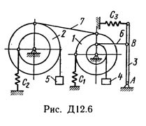 Готовое решение задачи Д12 Вариант 64 по теоретической механике из Тарга С.М. 1989 г.. Условие к задаче Динамика 12 (стр. 101 в методичке Тарга): Механизм, расположенный в вертикальной плоскости (рис. Д12.0 — Д12.9), состоит из ступенчатых колес 1 и 2 с радиусами R1 = 0,4 м, r1 = 0,2 м, R2 = 0,5 м, r2 = 0,3 м, имеющих неподвижные оси вращения; однородного стержня 3 длиной l =1,2 м, закрепленного шарниром на одном из концов; грузов 4 и 5, подвешенных к нитям, намотанным на колеса. На стержне расстояние АВ = 2l/3. Стержень 3 соединен с колесом 2 невесомым стержнем 6. Колеса 1 и 2 или находятся в зацеплении (рис. 0—4), или соединены невесомым стержнем 7 (рис. 5—9). К колесам и стержню 3 прикреплены пружины. В табл. Д12 заданы массы mi тел (кг) и коэффициенты жесткости ci пружин (Н/м). Прочерки в столбцах таблицы означают, что соответствующие тела или пружины в систему не входят (на чертеже эти тела и пружины не изображать); в результате в каждом конкретном варианте получается довольно простой механизм, содержащий три или даже два тела. Стержень 6 или 7 входит в состав механизма, когда в него входят оба тела, соединенные этим стержнем. В положениях, изображенных на рисунках, механизм находится в равновесии. Определить частоту и период малых колебаний системы около положения равновесия. Найти также, чему равно статическое удлинение (сжатие) пружины λст в положении равновесия. При подсчетах считать колеса 1 и 2 сплошными однородными цилиндрами радиусов R1 и R2 соответственно. Рассмотрим два примера решения этой задачи.