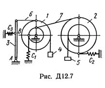 Готовое решение задачи Д12 Вариант 77 по теоретической механике из Тарга С.М. 1989 г.. Условие к задаче Динамика 12 (стр. 101 в методичке Тарга): Механизм, расположенный в вертикальной плоскости (рис. Д12.0 — Д12.9), состоит из ступенчатых колес 1 и 2 с радиусами R1 = 0,4 м, r1 = 0,2 м, R2 = 0,5 м, r2 = 0,3 м, имеющих неподвижные оси вращения; однородного стержня 3 длиной l =1,2 м, закрепленного шарниром на одном из концов; грузов 4 и 5, подвешенных к нитям, намотанным на колеса. На стержне расстояние АВ = 2l/3. Стержень 3 соединен с колесом 2 невесомым стержнем 6. Колеса 1 и 2 или находятся в зацеплении (рис. 0—4), или соединены невесомым стержнем 7 (рис. 5—9). К колесам и стержню 3 прикреплены пружины. В табл. Д12 заданы массы mi тел (кг) и коэффициенты жесткости ci пружин (Н/м). Прочерки в столбцах таблицы означают, что соответствующие тела или пружины в систему не входят (на чертеже эти тела и пружины не изображать); в результате в каждом конкретном варианте получается довольно простой механизм, содержащий три или даже два тела. Стержень 6 или 7 входит в состав механизма, когда в него входят оба тела, соединенные этим стержнем. В положениях, изображенных на рисунках, механизм находится в равновесии. Определить частоту и период малых колебаний системы около положения равновесия. Найти также, чему равно статическое удлинение (сжатие) пружины λст в положении равновесия. При подсчетах считать колеса 1 и 2 сплошными однородными цилиндрами радиусов R1 и R2 соответственно. Рассмотрим два примера решения этой задачи.