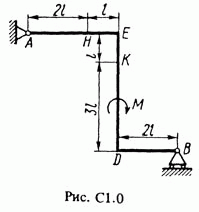 Решение задачи С1 Вариант 06 по теоретической механике из Тарга С.М. 1988 г.. Условие к задаче из раздела Статика 1 (стр. 12 в методичке Тарга): Жесткая рама, расположенная в вертикальной плоскости (рис. С1.0 — С1.9, табл. С1), закреплена в точке А шарнирно, а в точке В прикреплена или к невесомому стержню ВВ1, или к шарнирной опоре на катках; стержень прикреплен к раме и к неподвижной опоре шарнирами. На раму действуют пара сил с моментом М = 100 кН*м и две силы, значения, направления и точки приложения которых указаны в таблице (например, в условиях № 1 на раму действует сила F1 = 10 Н под углом 30° к горизонтальной оси, приложенная в точке K и сила F4 = 40 Н под углом 60° к горизонтальной оси, приложенная в точке H, и т. д.). Определить реакции связей в точках A, В, вызываемые заданными нагрузками. При окончательных расчетах принять l = 0,5 м.