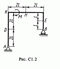 Решение задачи С1 Вариант 27 по теоретической механике из Тарга С.М. 1988 г.. Условие к задаче из раздела Статика 1 (стр. 12 в методичке Тарга): Жесткая рама, расположенная в вертикальной плоскости (рис. С1.0 — С1.9, табл. С1), закреплена в точке А шарнирно, а в точке В прикреплена или к невесомому стержню ВВ1, или к шарнирной опоре на катках; стержень прикреплен к раме и к неподвижной опоре шарнирами. На раму действуют пара сил с моментом М = 100 кН*м и две силы, значения, направления и точки приложения которых указаны в таблице (например, в условиях № 1 на раму действует сила F1 = 10 Н под углом 30° к горизонтальной оси, приложенная в точке K и сила F4 = 40 Н под углом 60° к горизонтальной оси, приложенная в точке H, и т. д.). Определить реакции связей в точках A, В, вызываемые заданными нагрузками. При окончательных расчетах принять l = 0,5 м.