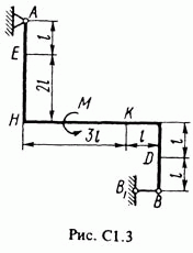 Решение задачи С1 Вариант 33 по теоретической механике из Тарга С.М. 1988 г.. Условие к задаче из раздела Статика 1 (стр. 12 в методичке Тарга): Жесткая рама, расположенная в вертикальной плоскости (рис. С1.0 — С1.9, табл. С1), закреплена в точке А шарнирно, а в точке В прикреплена или к невесомому стержню ВВ1, или к шарнирной опоре на катках; стержень прикреплен к раме и к неподвижной опоре шарнирами. На раму действуют пара сил с моментом М = 100 кН*м и две силы, значения, направления и точки приложения которых указаны в таблице (например, в условиях № 1 на раму действует сила F1 = 10 Н под углом 30° к горизонтальной оси, приложенная в точке K и сила F4 = 40 Н под углом 60° к горизонтальной оси, приложенная в точке H, и т. д.). Определить реакции связей в точках A, В, вызываемые заданными нагрузками. При окончательных расчетах принять l = 0,5 м.