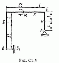 Решение задачи С1 Вариант 44 по теоретической механике из Тарга С.М. 1988 г.. Условие к задаче из раздела Статика 1 (стр. 12 в методичке Тарга): Жесткая рама, расположенная в вертикальной плоскости (рис. С1.0 — С1.9, табл. С1), закреплена в точке А шарнирно, а в точке В прикреплена или к невесомому стержню ВВ1, или к шарнирной опоре на катках; стержень прикреплен к раме и к неподвижной опоре шарнирами. На раму действуют пара сил с моментом М = 100 кН*м и две силы, значения, направления и точки приложения которых указаны в таблице (например, в условиях № 1 на раму действует сила F1 = 10 Н под углом 30° к горизонтальной оси, приложенная в точке K и сила F4 = 40 Н под углом 60° к горизонтальной оси, приложенная в точке H, и т. д.). Определить реакции связей в точках A, В, вызываемые заданными нагрузками. При окончательных расчетах принять l = 0,5 м.