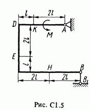 Решение задачи С1 Вариант 54 по теоретической механике из Тарга С.М. 1988 г.. Условие к задаче из раздела Статика 1 (стр. 12 в методичке Тарга): Жесткая рама, расположенная в вертикальной плоскости (рис. С1.0 — С1.9, табл. С1), закреплена в точке А шарнирно, а в точке В прикреплена или к невесомому стержню ВВ1, или к шарнирной опоре на катках; стержень прикреплен к раме и к неподвижной опоре шарнирами. На раму действуют пара сил с моментом М = 100 кН*м и две силы, значения, направления и точки приложения которых указаны в таблице (например, в условиях № 1 на раму действует сила F1 = 10 Н под углом 30° к горизонтальной оси, приложенная в точке K и сила F4 = 40 Н под углом 60° к горизонтальной оси, приложенная в точке H, и т. д.). Определить реакции связей в точках A, В, вызываемые заданными нагрузками. При окончательных расчетах принять l = 0,5 м.