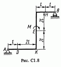 Решение задачи С1 Вариант 83 по теоретической механике из Тарга С.М. 1988 г.. Условие к задаче из раздела Статика 1 (стр. 12 в методичке Тарга): Жесткая рама, расположенная в вертикальной плоскости (рис. С1.0 — С1.9, табл. С1), закреплена в точке А шарнирно, а в точке В прикреплена или к невесомому стержню ВВ1, или к шарнирной опоре на катках; стержень прикреплен к раме и к неподвижной опоре шарнирами. На раму действуют пара сил с моментом М = 100 кН*м и две силы, значения, направления и точки приложения которых указаны в таблице (например, в условиях № 1 на раму действует сила F1 = 10 Н под углом 30° к горизонтальной оси, приложенная в точке K и сила F4 = 40 Н под углом 60° к горизонтальной оси, приложенная в точке H, и т. д.). Определить реакции связей в точках A, В, вызываемые заданными нагрузками. При окончательных расчетах принять l = 0,5 м.