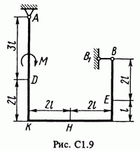 Решение задачи С1 Вариант 93 по теоретической механике из Тарга С.М. 1988 г.. Условие к задаче из раздела Статика 1 (стр. 12 в методичке Тарга): Жесткая рама, расположенная в вертикальной плоскости (рис. С1.0 — С1.9, табл. С1), закреплена в точке А шарнирно, а в точке В прикреплена или к невесомому стержню ВВ1, или к шарнирной опоре на катках; стержень прикреплен к раме и к неподвижной опоре шарнирами. На раму действуют пара сил с моментом М = 100 кН*м и две силы, значения, направления и точки приложения которых указаны в таблице (например, в условиях № 1 на раму действует сила F1 = 10 Н под углом 30° к горизонтальной оси, приложенная в точке K и сила F4 = 40 Н под углом 60° к горизонтальной оси, приложенная в точке H, и т. д.). Определить реакции связей в точках A, В, вызываемые заданными нагрузками. При окончательных расчетах принять l = 0,5 м.