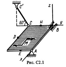 Решение задачи С2 Вариант 17 по теормеху из Тарга С.М. 1988 г.. Условие к задаче из раздела Статика 2 (стр. 15 в методичке Тарг С.М.): Однородная прямоугольная плита весом P = 5 кН со сторонами AB = 3l, BC = 2l закреплена в точке А сферическим шарниром (подшипником) и удерживается в равновесии невесомым стержнем CC’ (рис. С2.0 – С2.9). На плиту действуют пара сил с моментом M = 6 кН*м, лежащая в плоскости плиты, и две силы. Значения этих сил, их направления и точки приложения указаны в табл. С2; при этом силы F1 и F4 лежат в плоскостях, параллельных плоскости xy, сила F2 – в плоскости, параллельной xz, сила F3 – в плоскости, параллельной yz. Точки приложения сил (D, E, H) находятся в серединах сторон плиты. Определить реакции связей в точках A, B и C. При подсчетах принять l = 0,8 м.
