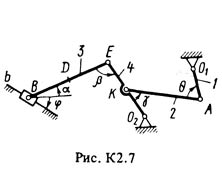Решение к задаче К2 Вариант 79 по термеху из задачника Тарга С.М. 1988 г.. Условие к задаче из раздела Кинематика 2 (стр. 22 в методичке Тарг С.М.): Плоский механизм состоит из стержней 1 – 4 и ползуна B, соединенных друг с другом и с неподвижными опорами O1 и O2 шарнирами (рис. К2.0-К2.9). Длины стержней: l1 = 0,4 м, l2 = 1,2 м, l3 = 1,4 м, l4 = 0,8 м. Положение механизма определяется углами а, b, γ, фи, тетта, которые вместе с другими величинами заданы в табл. К2. Точка D на всех рисунках и точка К на рис. К2.7-К2.9 в середине соответствующего стержня. Определить величины, указанные в таблице в столбце «Найти». Найти также ускорение aA точки А стержня 1, если стержень 1 имеет в данный момент времени угловое ускорение ε1 = 10 с-2 Дуговые стрелки на рисунках показывают, как при построении чертежа должны откладываться соответствующие углы, т.е. по ходу или против хода часовой стрелки (например, угол γ на рис. 1 следует отложить от стержня DE против хода часовой стрелки, а на рис. 2 – от стержня AE по ходу часовой стрелки). Построение чертежа начинать со стержня, направление которого определяется углом α; ползун В и его направляющие для большей наглядности изобразить, как в примере К2 (см. рис. К2). Заданную угловую скорость считать направленной против хода часовой стрелки, а заданную скорость vB – от точки В к b.