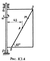 Решение к задаче К3 Вариант 42 по теоретической механике из методичке Тарга С.М. 1988 г.. Условие к задаче Кинематика №2 (стр. 26 в методичке Тарг С.М.): Прямоугольная пластина (рис. К3.0-К3.5) или круглая пластина радиусом R = 60 см (рис. К3.6-К3.9) вращается вокруг неподвижной оси с постоянной угловой скоростью "омега", заданной в таблице К3 (при знаке минус направление "омега" противоположно показанному на рисунке). Ось вращения на рис. К3.0-К3.3 и К3.8, К3.9 перпендикулярна плоскости пластины и проходит через точку О (пластина вращается в своей плоскости); на рис. К3.4-К3.7 ось вращения ОО1 лежит в плоскости пластины (пластина вращается в пространстве). По пластине вдоль прямой BD (рис. К3.0-К3.5) или по окружности радиуса R, т. е. по ободу пластины (рис. К3.6-К3.9), движется точка М. Закон ее относительного движения, выражаемый уравнением s = AM = f(t) (s – в сантиметрах, t – в секундах), задан в табл. К№ отдельно для рис. К3.0-К3.5 и для рис. К3.6-К3.9,при этом на рис. 6-9 s = AM и отсчитывается по дуге окружности; там же даны размеры b и l. На всех рисунках точка М показаны в положении, при котором s = AM > 0 (при s < 0 точка М находится по другую сторону от точки A). Определить абсолютную скорость и абсолютное ускорение точки М в момент времени t1 = 1 с.
