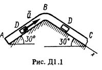 Решение к задаче Д1 Вариант 14 по термеху из задачника Тарга С.М. 1988 г.. Условие к задаче из раздела Динамика 1 (стр. 32 в методичке Тарг С.М.): Груз D массой m, получив в точке А начальную скорость v0, движется в изогнутой трубе ABC, расположенной в вертикальной плоскости; участки трубы или оба наклонные, или один горизонтальный, а другой наклонный (рис. Д1.0-Д1.9 табл. Д1). На рисунке АВ на груз кроме силы тяжести действуют постоянная сила Q (ее направление показано на рисунках) и сила сопротивления среды R, зависит от скорости груза v (направлена против движения). В точке В груз, не изменяя значения своей скорости, переходит на участок ВС трубы, где на него кроме силы тяжести действует переменная сила F, проекция которой Fx на ось x задана в таблице. Считая груз материальной точкой и зная расстояние АВ = l или время t1 движения груза от точки А до точки В. Найти закон движения груза на участке ВС, т.е. x = f(t), где x = BD. Трением груза о трубу пренебречь.