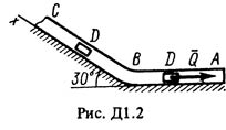 Решение к задаче Д1 Вариант 24 по термеху из задачника Тарга С.М. 1988 г.. Условие к задаче из раздела Динамика 1 (стр. 32 в методичке Тарг С.М.): Груз D массой m, получив в точке А начальную скорость v0, движется в изогнутой трубе ABC, расположенной в вертикальной плоскости; участки трубы или оба наклонные, или один горизонтальный, а другой наклонный (рис. Д1.0-Д1.9 табл. Д1). На рисунке АВ на груз кроме силы тяжести действуют постоянная сила Q (ее направление показано на рисунках) и сила сопротивления среды R, зависит от скорости груза v (направлена против движения). В точке В груз, не изменяя значения своей скорости, переходит на участок ВС трубы, где на него кроме силы тяжести действует переменная сила F, проекция которой Fx на ось x задана в таблице. Считая груз материальной точкой и зная расстояние АВ = l или время t1 движения груза от точки А до точки В. Найти закон движения груза на участке ВС, т.е. x = f(t), где x = BD. Трением груза о трубу пренебречь.