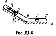 Решение к задаче Д1 Вариант 89 по термеху из задачника Тарга С.М. 1988 г.. Условие к задаче из раздела Динамика 1 (стр. 32 в методичке Тарг С.М.): Груз D массой m, получив в точке А начальную скорость v0, движется в изогнутой трубе ABC, расположенной в вертикальной плоскости; участки трубы или оба наклонные, или один горизонтальный, а другой наклонный (рис. Д1.0-Д1.9 табл. Д1). На рисунке АВ на груз кроме силы тяжести действуют постоянная сила Q (ее направление показано на рисунках) и сила сопротивления среды R, зависит от скорости груза v (направлена против движения). В точке В груз, не изменяя значения своей скорости, переходит на участок ВС трубы, где на него кроме силы тяжести действует переменная сила F, проекция которой Fx на ось x задана в таблице. Считая груз материальной точкой и зная расстояние АВ = l или время t1 движения груза от точки А до точки В. Найти закон движения груза на участке ВС, т.е. x = f(t), где x = BD. Трением груза о трубу пренебречь.