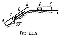Решение к задаче Д1 Вариант 94 по термеху из задачника Тарга С.М. 1988 г.. Условие к задаче из раздела Динамика 1 (стр. 32 в методичке Тарг С.М.): Груз D массой m, получив в точке А начальную скорость v0, движется в изогнутой трубе ABC, расположенной в вертикальной плоскости; участки трубы или оба наклонные, или один горизонтальный, а другой наклонный (рис. Д1.0-Д1.9 табл. Д1). На рисунке АВ на груз кроме силы тяжести действуют постоянная сила Q (ее направление показано на рисунках) и сила сопротивления среды R, зависит от скорости груза v (направлена против движения). В точке В груз, не изменяя значения своей скорости, переходит на участок ВС трубы, где на него кроме силы тяжести действует переменная сила F, проекция которой Fx на ось x задана в таблице. Считая груз материальной точкой и зная расстояние АВ = l или время t1 движения груза от точки А до точки В. Найти закон движения груза на участке ВС, т.е. x = f(t), где x = BD. Трением груза о трубу пренебречь.