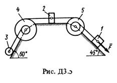 Решение задачи Д3 Вариант 50 по теоретической механике из задачника Тарга С.М. 1988 года. Условие задачи Д3 (стр. 44 в методичке Тарг С.М.): Механическая система состоит из грузов 1 и2 (коэффициент трения грузов о плоскость F = 0,1), цилиндрического сплошного однородного катка 3 и ступенчатых шкивов 4 и 5 с радиусами ступеней R4 = 0,3 м, r4 = 0,1 м, R5 = 0,2 м, r5 = 0,1 м (массу каждого шкива считать равномерно распределенной по его внешнему ободу) (рис. Д3.0-Д3.9, табл. Д3). Тела системы соединены друг с другом нитями, намотанными на шкивы; участки нитей параллельны соответствующим плоскостям. Под действием силы F = f(x), зависящей от перемещения точки приложения силы, система приходит в движение из состояния покоя. При движении системы на шкивы 4 и 5 действуют постоянные моменты сил сопротивлений, равные соответственно M4 и M5. Определить значение искомой величины в тот момент времени, когда перемещение точки приложения силы F равно s1.