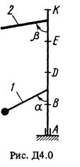 Решение задачи Д4 Вариант 00 по теоретической механике из задачника Тарга С.М. 1988 года. Условие задачи Д4 (стр. 48 в методичке Тарг С.М.): Вертикальный вал AK (рис. Д4.0-Д4.9, табл. Д4), вращающийся с постоянной угловой скоростью ω = 10 с-1, закреплен подпятником в точке А и цилиндрическим подшипником в точке, указанной в табл. Д4 в столбце 2 (AB = BD = DE = EK = b). К валу жестко прикреплены невесомый стержень 1 длиной l1 = 0,4 м с точечной массой m1 = 6 кг на конце и однородный стержень 2 длиной l2 = 0,6 м, имеющий массу m2 = 4 кг; оба стержня лежат в одной плоскости. Точки крепления стержней к валу указаны в таблице в столбцах 3 и 4, а углы α и β – в столбцах 5 и 6. Пренебрегая весом вала, определить реакции подпятника и подшипника. При окончательных подсчетах принять b = 0,4 м.