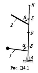 Решение задачи Д4 Вариант 17 по теоретической механике из задачника Тарга С.М. 1988 года. Условие задачи Д4 (стр. 48 в методичке Тарг С.М.): Вертикальный вал AK (рис. Д4.0-Д4.9, табл. Д4), вращающийся с постоянной угловой скоростью ω = 10 с-1, закреплен подпятником в точке А и цилиндрическим подшипником в точке, указанной в табл. Д4 в столбце 2 (AB = BD = DE = EK = b). К валу жестко прикреплены невесомый стержень 1 длиной l1 = 0,4 м с точечной массой m1 = 6 кг на конце и однородный стержень 2 длиной l2 = 0,6 м, имеющий массу m2 = 4 кг; оба стержня лежат в одной плоскости. Точки крепления стержней к валу указаны в таблице в столбцах 3 и 4, а углы α и β – в столбцах 5 и 6. Пренебрегая весом вала, определить реакции подпятника и подшипника. При окончательных подсчетах принять b = 0,4 м.