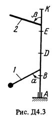 Решение задачи Д4 Вариант 34 по теоретической механике из задачника Тарга С.М. 1988 года. Условие задачи Д4 (стр. 48 в методичке Тарг С.М.): Вертикальный вал AK (рис. Д4.0-Д4.9, табл. Д4), вращающийся с постоянной угловой скоростью ω = 10 с-1, закреплен подпятником в точке А и цилиндрическим подшипником в точке, указанной в табл. Д4 в столбце 2 (AB = BD = DE = EK = b). К валу жестко прикреплены невесомый стержень 1 длиной l1 = 0,4 м с точечной массой m1 = 6 кг на конце и однородный стержень 2 длиной l2 = 0,6 м, имеющий массу m2 = 4 кг; оба стержня лежат в одной плоскости. Точки крепления стержней к валу указаны в таблице в столбцах 3 и 4, а углы α и β – в столбцах 5 и 6. Пренебрегая весом вала, определить реакции подпятника и подшипника. При окончательных подсчетах принять b = 0,4 м.