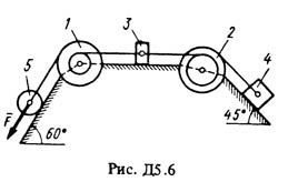Готовое решение задачи Д5 Вариант 66 по теормеху из задачника Тарга С.М. 1988 года. Смотрите условие к задаче Д5 (стр. 52 в методичке Тарг С.М.): Механическая система состоит из ступенчатых шкивов 1 и2 весом P1 и P2 с радиусами ступеней R1 = R, r1 = 0,4R; R2 = R, r3 = 0,8R (массу каждого шкива считать равномерно распределенной по его внешнему ободу); грузов 3, 4 и сплошного однородного цилиндрического катка 5 весом P3, P4, P5 соответственно (рис. Д5.0-Д5.9 табл. Д5). Тела системы соединены нитями, намотанными на шкивы; участки нитей параллельны соответствующим плоскостям. Грузы Скользят по плоскостям без трения, а катки катятся без скольжения. Кроме сил тяжести на одно из тел системы действует постоянная сила F, а на шкивы 1 и 2 при их вращении действуют постоянные моменты сил сопротивления, равные соответственно M1 и M2. Составить для данной системы уравнение Лагранжа и определить из него величину, указанную в таблице в столбце «Найти», где обозначено: е1, е2 – угловые ускорения шкивов 1 и 2; а3, а4, аС5 – ускорения грузов 3, 4 и центра масс катка 5 соответственно. Когда в задаче надо определить е1, е2, считать R = 0,25 м. Тот из грузов 3, 4 вес которого равен нулю, на чертеже не изображать. Шкивы 1 и 2 всегда входят в систему.