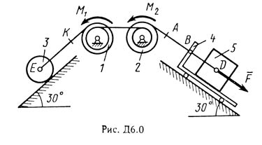 Решение задачи Д6 Вариант 07 по теормеху из методички Тарга С.М. 1988 года (Также совпадает с задачей Д8 Тарг 1983). Сверьте условие к задаче Д6 (стр. 56 в методичке Тарг С.М.): Механическая система состоит из тел 1, 2, 3, 4, 5, имеющих веса Р1, Р2, Р3, Р4, P5 соответственно; тела системы связаны нитями, намотанными на ступенчатые блоки 1 и 2 (рис. Д6.0-Д6.9, табл. Д6). Прочерк в столбцах таблицы, где заданы веса, означает, что соответствующее тело в систему не входит (на чертеже не изображать), а ноль в столбцах таблицы означает, что тело считается невесомым, но в систему входит (на чертеже должно быть изображено). Для колес, обозначенных номером 4, Р4 - их общий вес (вес платформы такой тележки не учитывается). Радиусы ступенчатых блоков 1 и 2 равны соответственно: R1=R, r1 = 0,8R; R2 = R, r2 = 0,4 R. При вычислении моментов инерции оба блока, колеса и катки считать однородными цилиндрами радиуса R. На систему кроме сил тяжести действуют сила F. приложенная к телу 4 или 5 (если тело 5 в систему не входит, сила приложена в точке В к тележке), и пары сил с моментами М1 и М2, приложенные к блокам (при М < 0 направление момента противоположно показанному на рисунке). На участке нити, указанном в таблице в столбце "Пружина", включена пружина с коэффициентом жесткости с (например, если в столбце стоит АВ, то участок АВ является пружиной, если AD то AD пружина, и т.д.) ; в начальный момент времени пружина не деформирована. Составить для системы уравнения Лагранжа и определить из них частоту и период колебаний, совершаемых телами системы при ее движении.