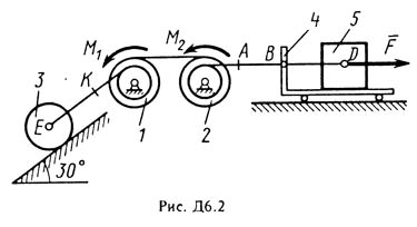 Решение задачи Д6 Вариант 24 по теормеху из методички Тарга С.М. 1988 года (Также совпадает с задачей Д8 Тарг 1983). Сверьте условие к задаче Д6 (стр. 56 в методичке Тарг С.М.): Механическая система состоит из тел 1, 2, 3, 4, 5, имеющих веса Р1, Р2, Р3, Р4, P5 соответственно; тела системы связаны нитями, намотанными на ступенчатые блоки 1 и 2 (рис. Д6.0-Д6.9, табл. Д6). Прочерк в столбцах таблицы, где заданы веса, означает, что соответствующее тело в систему не входит (на чертеже не изображать), а ноль в столбцах таблицы означает, что тело считается невесомым, но в систему входит (на чертеже должно быть изображено). Для колес, обозначенных номером 4, Р4 - их общий вес (вес платформы такой тележки не учитывается). Радиусы ступенчатых блоков 1 и 2 равны соответственно: R1=R, r1 = 0,8R; R2 = R, r2 = 0,4 R. При вычислении моментов инерции оба блока, колеса и катки считать однородными цилиндрами радиуса R. На систему кроме сил тяжести действуют сила F. приложенная к телу 4 или 5 (если тело 5 в систему не входит, сила приложена в точке В к тележке), и пары сил с моментами М1 и М2, приложенные к блокам (при М < 0 направление момента противоположно показанному на рисунке). На участке нити, указанном в таблице в столбце "Пружина", включена пружина с коэффициентом жесткости с (например, если в столбце стоит АВ, то участок АВ является пружиной, если AD то AD пружина, и т.д.) ; в начальный момент времени пружина не деформирована. Составить для системы уравнения Лагранжа и определить из них частоту и период колебаний, совершаемых телами системы при ее движении.